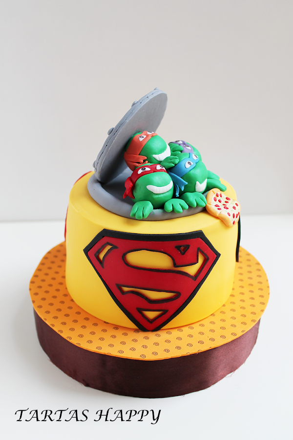 Hoy no traigo receta,os traigo una tarta que me encargó Carmen para sus nietos,no es que cumplan años todos juntos,iban a cenar todos en casa y ella quería sorprender a sus nietos con una tarta a ellos les gusta mucho los superhéroes pero como no sabía por cual decidirse los pusimos todos los que le gustan a ellos.