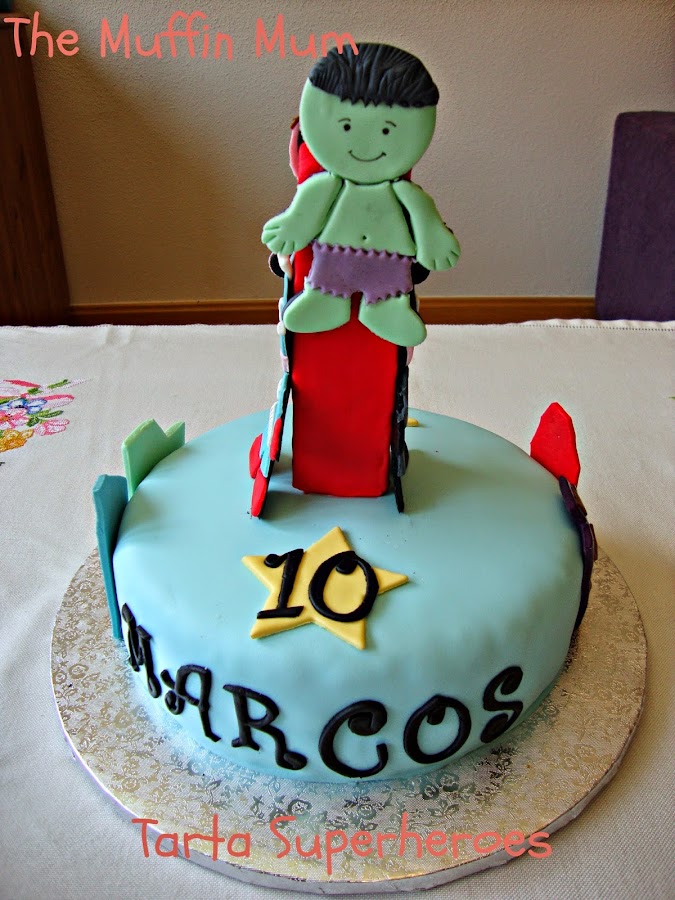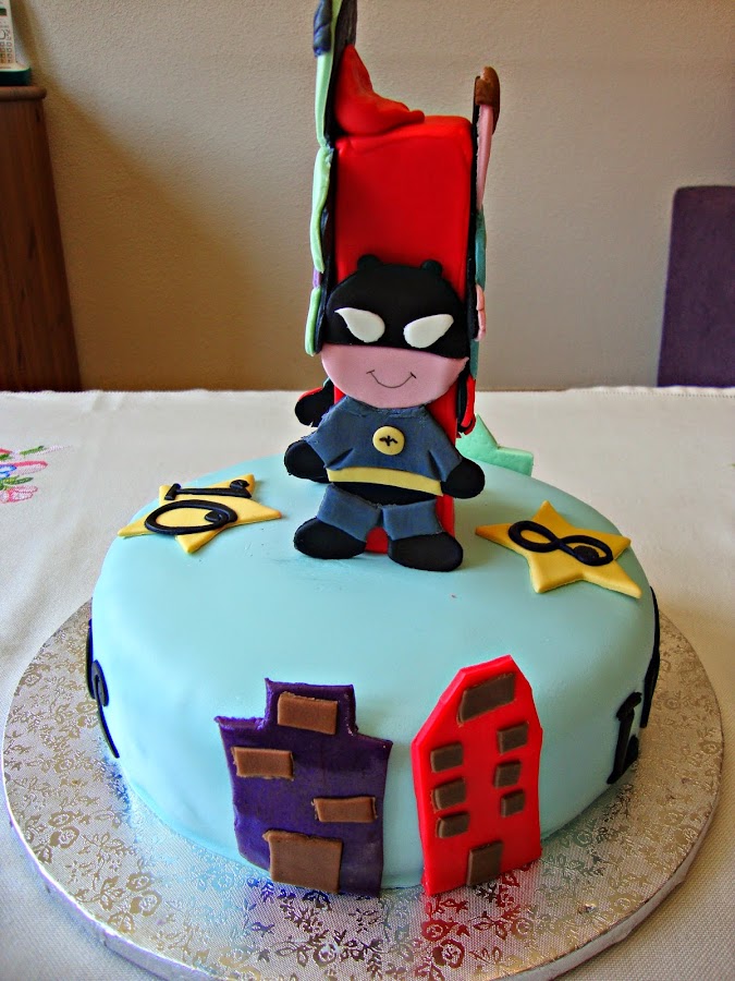 Había cuatro superhéroes, cada uno mirando hacia una zona de la tarta y queria que tuviese una estética un poco de comic con los edificios.
