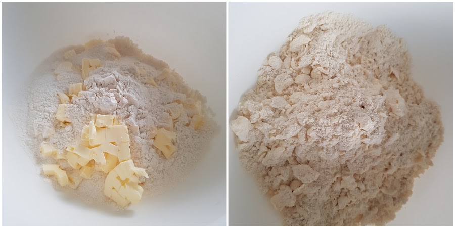 1. - Ponemos en un bol la harina tamizada con la mantequilla en dados y la mezclamos con las manos hasta que quede arenosa.