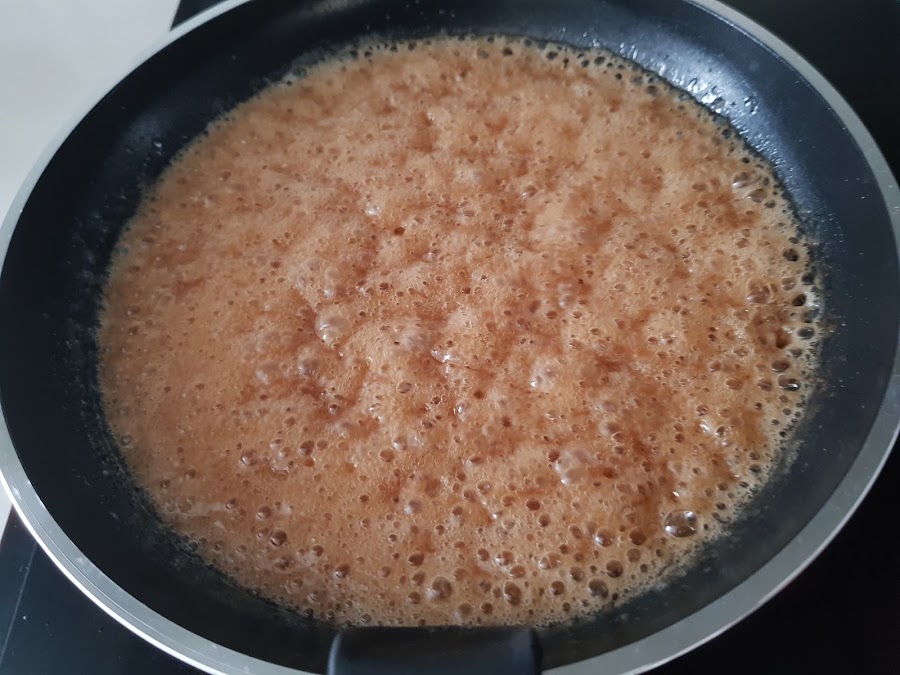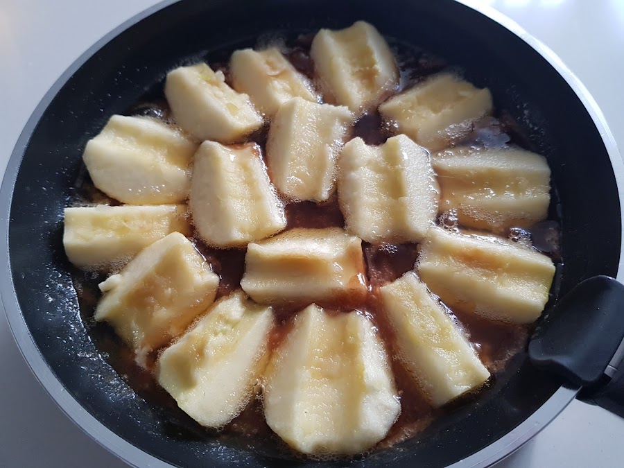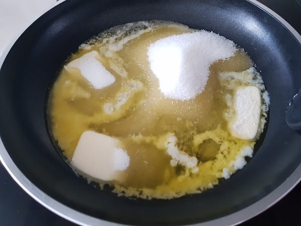 1. - Encendemos el horno a 200º. En una sartén o utensilio que podamos llevar luego al horno, ponemos la mantequilla y el azúcar a fuego fuerte para que se haga caramelo, pero no demasiado oscuro, que luego irá al horno. Y lo apartamos.