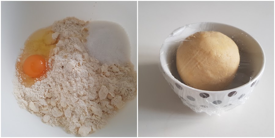2. - Añadimos el huevo, e azúcar y la pizca de sal y mezclamos hasta hacer una bola y la dejamos reposar en la nevera tapada con un film.