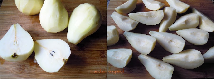 Pela las peras, córtalas por la mitad y descorazónalas.