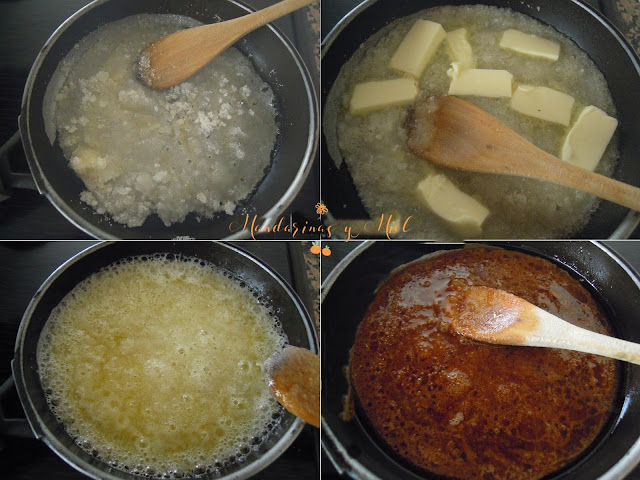 Cuando se haya disuelto el azúcar y empiece a caramelizar, remueve con una cuchara, añade ahora la mantequilla en trocitos y remueve hasta que se disuelva.