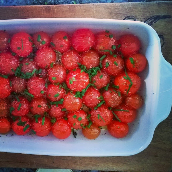 3. Colocamos, los tomates en una sartén o molde aptos tanto para el fuego como para el horno. Cuanto más ordenados y juntos coloquemos los tomates mejor quedará la tarta. Rociamos los tomates con el aceite, la sal, la pimienta negra, la miel, una cucharadita de albahaca seca, un poco de cebollino y el pan rallado. Los ponemos al fuego 2 o 3 minutos. (No será necesario darles la vuelta pues se harán en el horno)