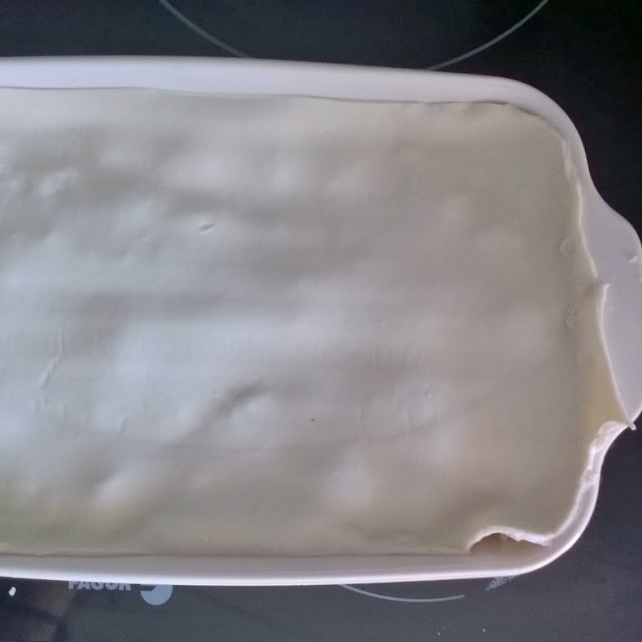 ¿Qué es ese decorado en cruz? Os preguntareis. Al tapar la tarta me he dado cuenta de que se me había olvidado el pan rallado, así que, he tenido que destaparla y al hacerlo se me ha roto un poco el hojadre. El decorado, por tanto, no es más que un apaño para intentar tapar algún que otro agujero indeseado.