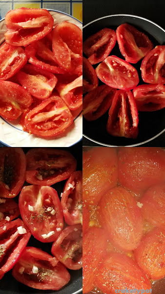 En una sartén ponemos muy poco aceite, y con fuego medio fuerte colocamos los tomates con la parte de las semillas hacia arriba, y dejamos hacer 5 minutos para sellarlos, le ponemos el ajo picado, sal y el tomillo, dejamos un par de minutos para no quemarlos; le damos la vuelta los dejamos hacer por ese lado otros 6 ó 7 minutos.
