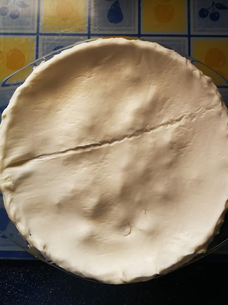 Extendemos el hojaldre sobre la fuente de horno, 1 cm más grande que el borde, cerramos y pinchamos un poco la superficie para que pierda humedad mientras se hornea durante 30 minutos, hasta que veamos el hojaldre dorado.