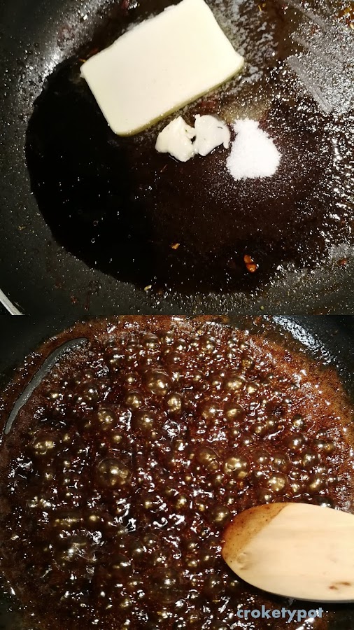 En la misma sartén, preparamos el caramelo, calentando la sartén con la mantequilla, el azúcar y el vinagre balsámico y dejamos que burbujee hasta que espese.
