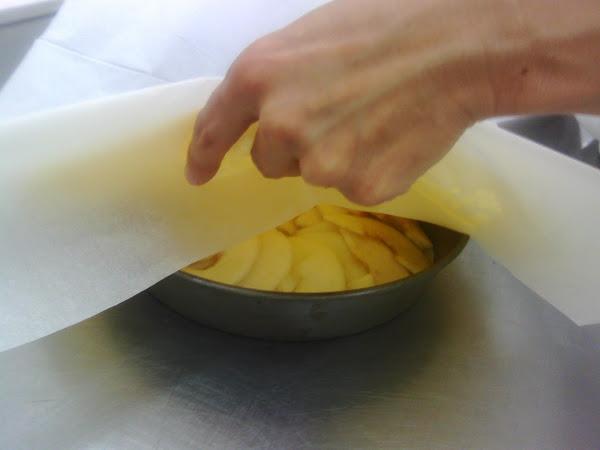 Dejamos caer la masa que toque el fondo de manzana, y cortamos la masa por el borde del molde. metemos el sobrante de la masa, por debajo de la manzana con cuidado. Igual que cuando metes las sabanas bajo la cama.