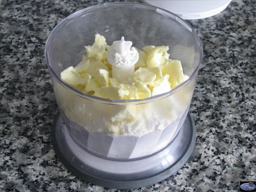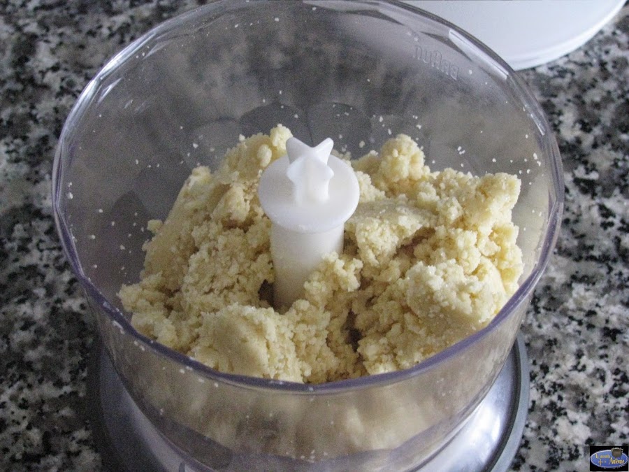 En la batidora mezclamos 175 grs de harina y 40 grs de azúcar y agregamos 100 grs de mantequilla que este fría. Le damos caña al aparato unos segundos,abrimos y despegamos la mezcla de las paredes. Lo repetimos dos o tres veces hasta que la mezcla quede como migas.Batimos un huevo y lo vamos añadiendo poco a poco a la mezcla y vamos moliendo con la máquina hasta que esté homogénea y si queda muy seca añadimos un par de cucharadas de agua fría. Sacamos y hacemos una bola que envolveremos en papel film y dejaremos en el frigo durante por lo menos 2 horas.