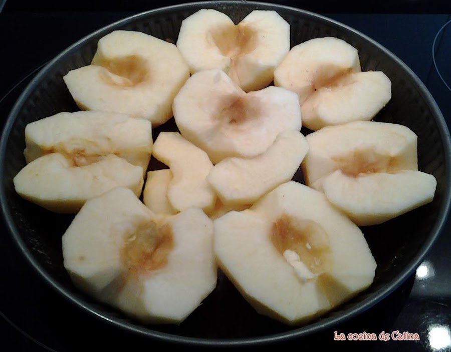 Darle la vuelta al molde y desmoldar la tarta de modo que las manzanas queden arriba. Esto hay que hacerlo mientras el caramelo esté caliente, si no no podremos desmoldarlo.