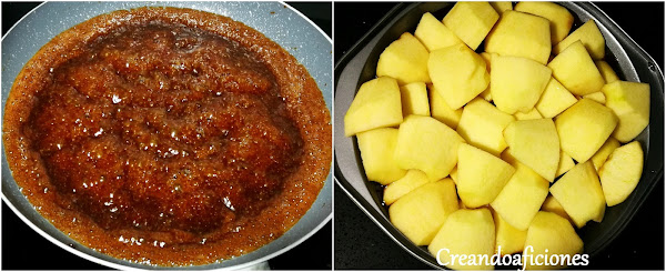 Echamos el caramelo en un molde para horno de unos 26 cm de diámetro y ponemos los trozos de manzanas bien juntos y los apilamos hasta rellenar todo el molde.
