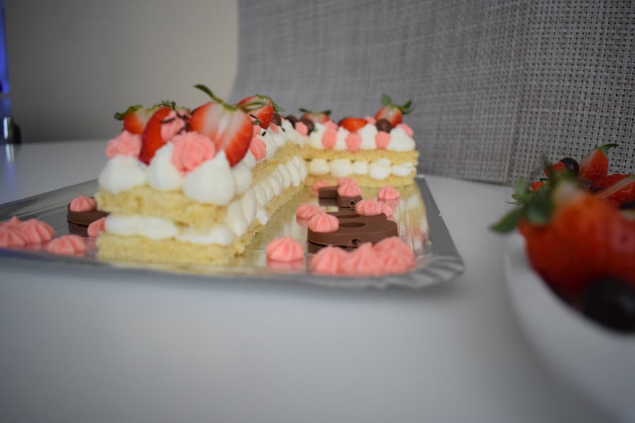 Para esta receta he dibujado la letra que quería en una cartulina, que es la que nos va a ayudar a la hora de cortar el bizcocho.