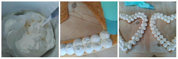 Ponemos la nata (crema de leche) en una manga pastelera con una boquilla lisa y rellenamos los corazones.