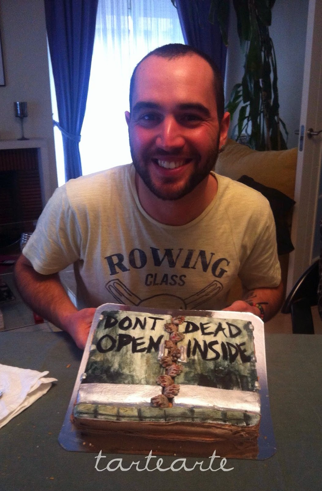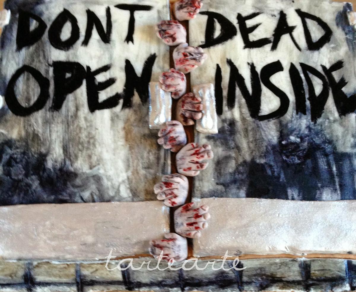 Este año tuve menos tiempo que otros años para preparar su tarta porque justo tuve dos tartas mas para ese fin de semana. Mi madre me dio la idea de hacer una sobre la serie The Walking Dead, por si alguien no la conoce salen muchos zombies (yo no la he visto, soy muy miedosa!!), que esta muy enganchado a ella.
