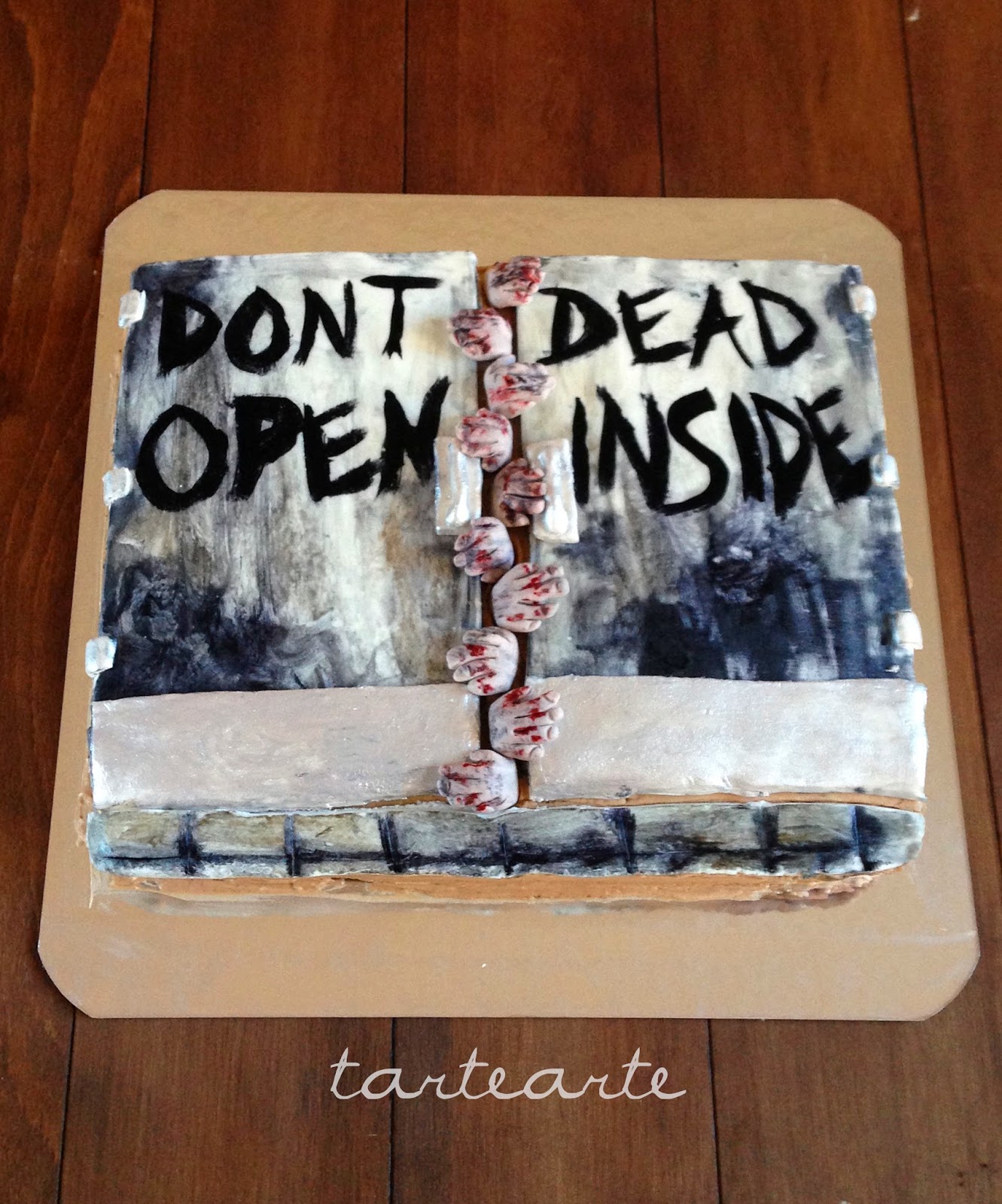 Las manos también son de fondant con CMC, las teñí como de gris y le pinte con colorante rojo como para simular la sangre. Me quedaron un poco rechonchas jajaja, pero me gusto el resultado.