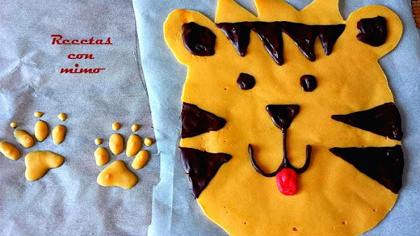Dejamos templar un poco y lo metemos en una manga pastelera con boquilla redonda fina. Dibujamos sobre un papel de horno la silueta de la cara del tigre y rellenamos después.