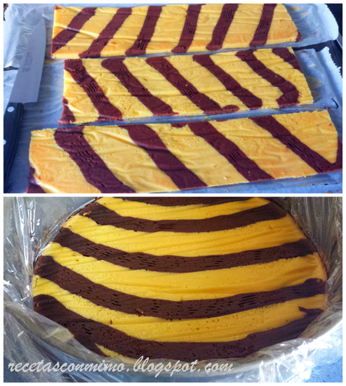 7 - Una vez fría cortamos la plancha rectangular en tiras de la medida aproximada de la altura del molde redondo.