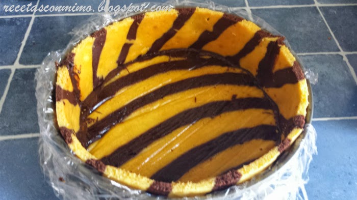 2 - Volcamos en el molde sobre el bizcocho y llevamos a la nevera al menos durante 4 horas para que cuaje bien.