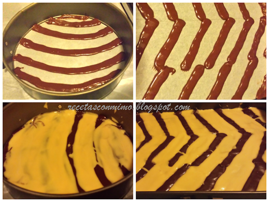 Ponemos la masa de chocolate en una manga pastelera y dibujamos las rayas en los moldes. Después rellenamos los espacios entre las rayas con una cuchara y paciencia.