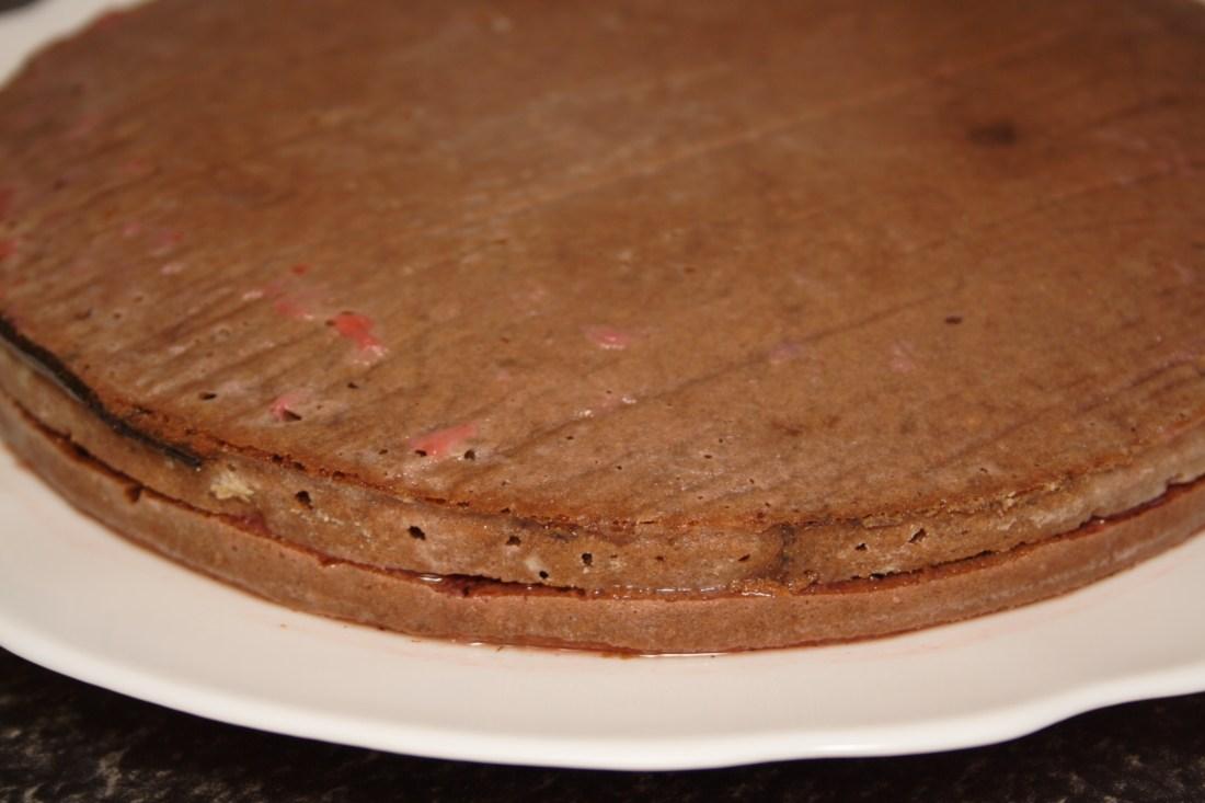 Empapamos bien por las dos caras la otra parte del bizcocho y tapamos con ella la capa de fresas.