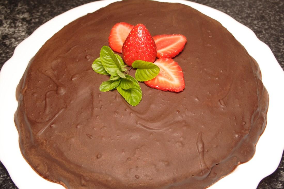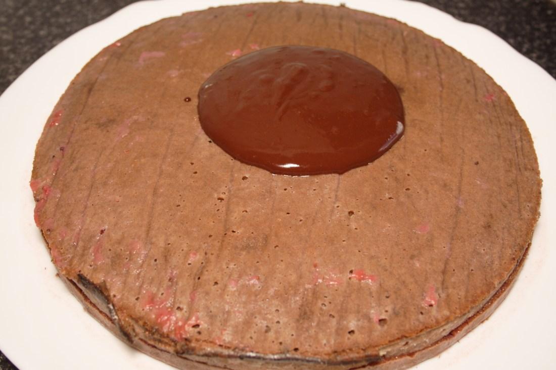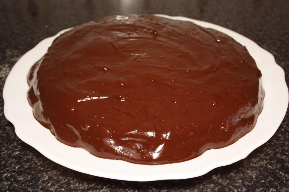 Y cubrimos con el chocolate de cobertura, dejamos que caiga por los bordes, a la vez que lo extendemos con una espátula o cuchara por toda la tarta.