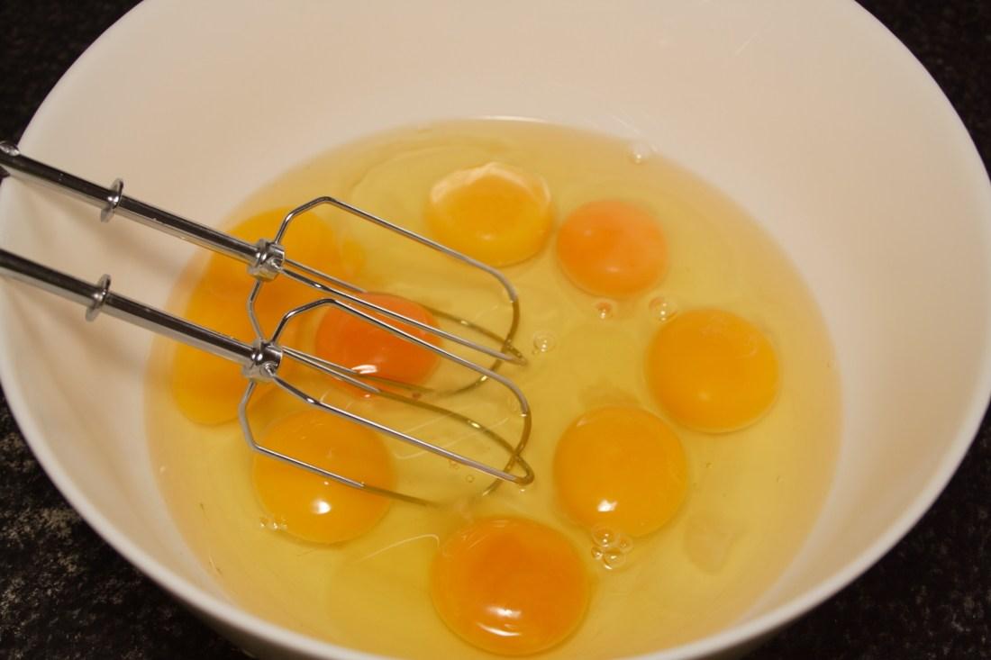 Mientras cascamos los huevos en un bol grande, con una batidora de varillas los vamos montando.
