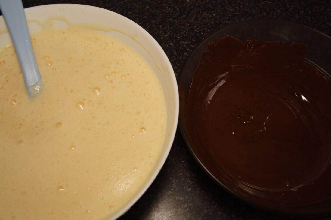 Añadimos la harina tamizada y mezclamos suavemente, con movimientos envolventes. Incorporamos el chocolate fundido y seguimos mezclando.