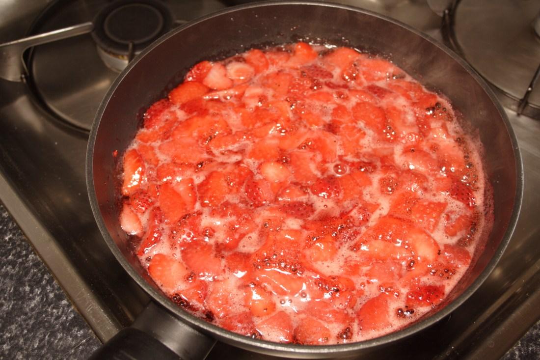 Al almíbar que soltaron las fresas le añadimos un buen chorro de ron, removemos y reservamos.