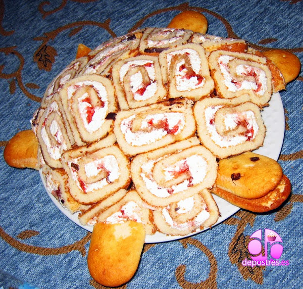 Esta tarta es muy similar a la tarta balón de fútbol pero mucho más fácil al no tener que hacer las planchas de bizcocho, ya que los brazos de gitano son comprados. No se quien será el ingenioso artífice de esta graciosa tortuga, pues es una tarta bomba simpáticamente caracterizada.