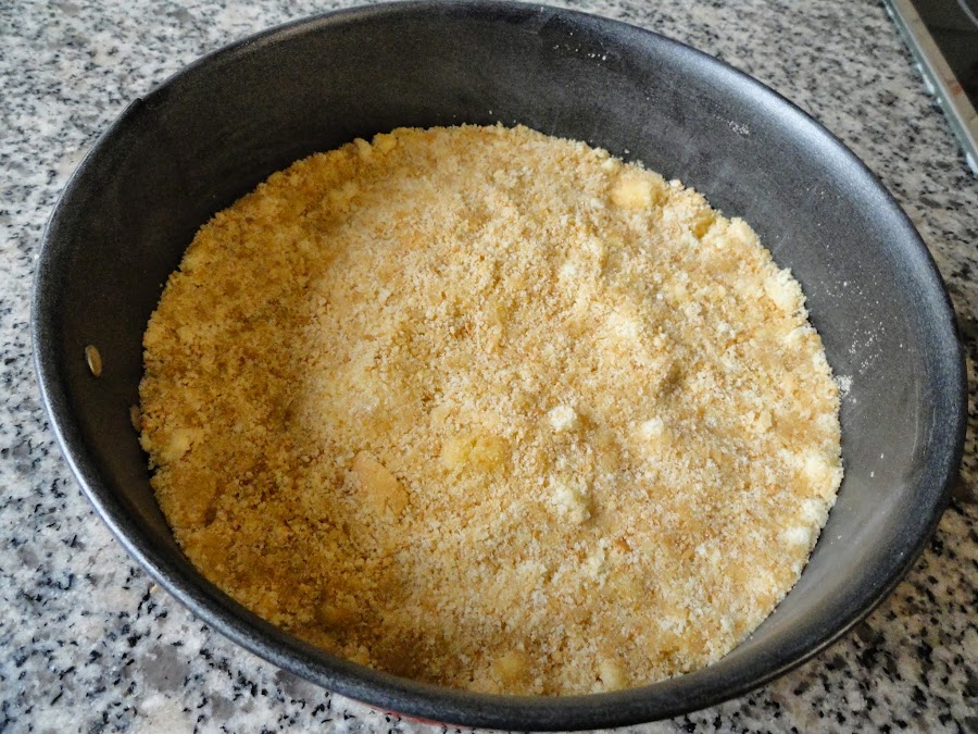 He triturado 2 minutos a velocidad 5 los bizcochos y los he mezclado fuera de la jarra con la mantequilla ligeramente fundida. Esta mezcla la colocamos en el molde presionando bien y ponemos en la nevera un buen rato para que endurezca. También se puede hacer con galletas, igualmente trituradas y mezcladas con mantequilla o con bizcocho genovés.
