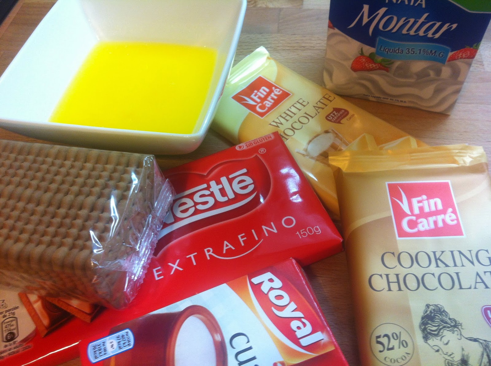 -Chocolate con leche: se procede de la misma forma que en la capa anterior. Se pone a hervir 250 mL de nata (crema de leche) con 100 mL de leche (ahora no añadí azúcar al ser más dulce).