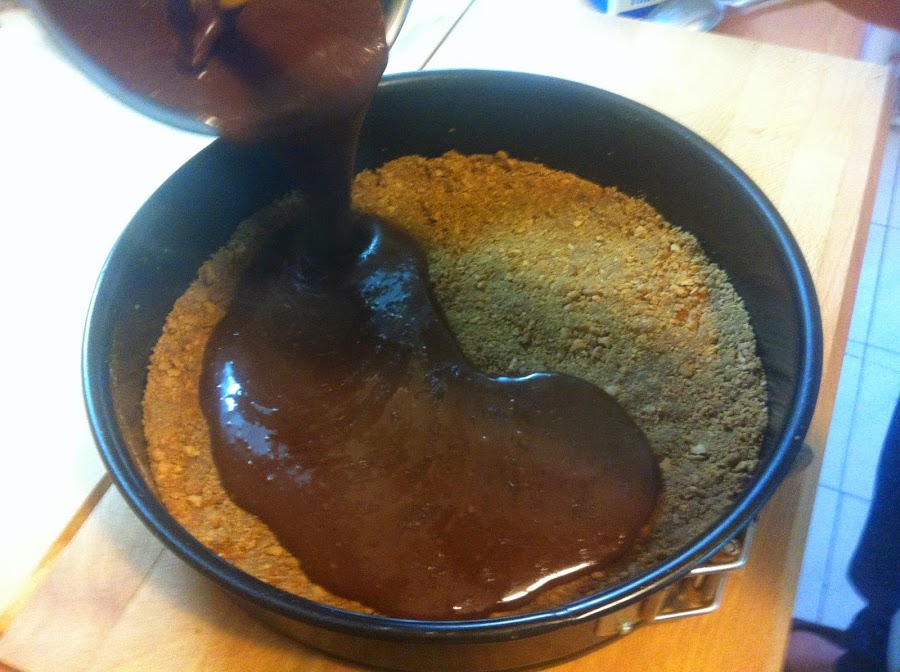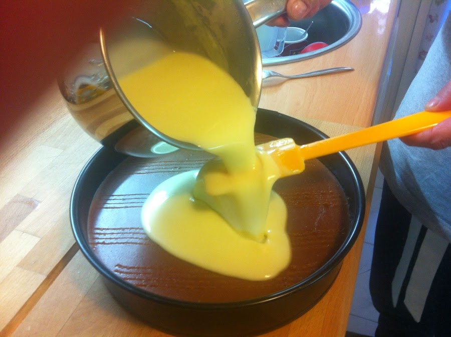Cuando haya dado un hervor se espera 1 minuto removiendo y se vierte sobre la base de galletas: