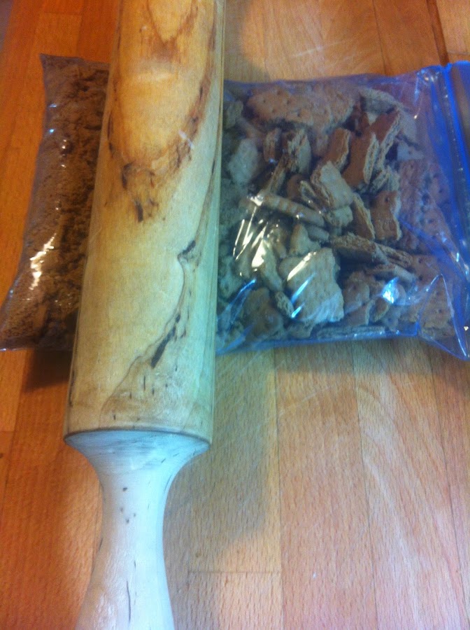 2 cucharadas de lecheSe trituran las galletas con un robot. Yo no dispongo de la máquina, así que meto las galletas troceadas en una bolsa de congelación, la cierro y paso el rodillo de madera por encima para reducirlas a polvo.