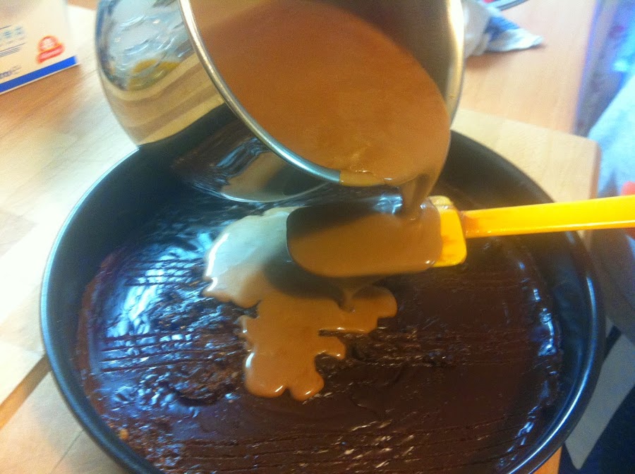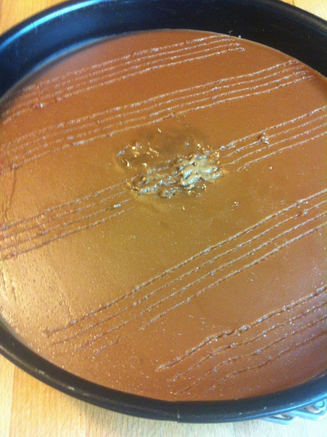 Antes de verterlo sobre el chocolate negro se pasa un tenedor haciendo unas líneas para que se asiente la otra capa y no se desplacen: