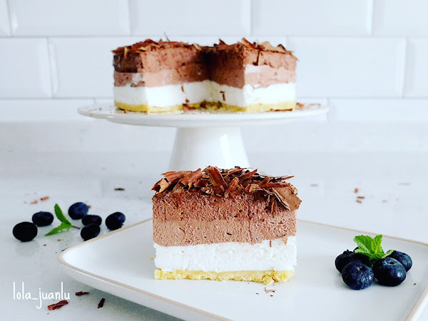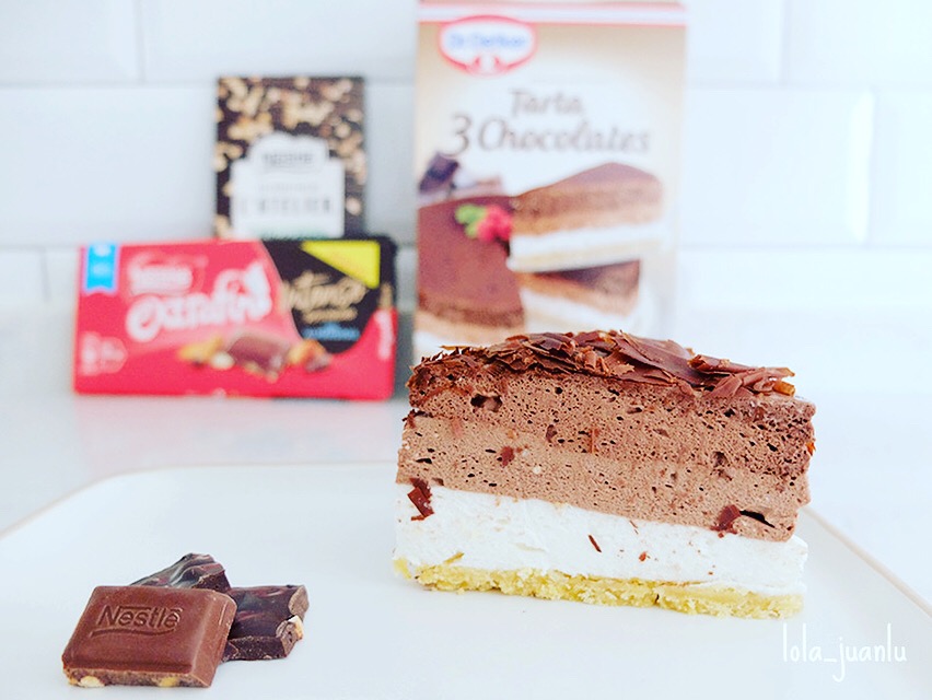 ¿Qué os parece esta deliciosa tarta de tres o cuatro chocolates, depende de cómo se mire? Es exquisita, muy fácil de preparar y con una vistosa presentación con la que podemos sorprender a nuestros invitados.