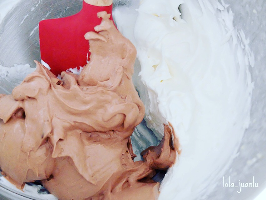 Sacamos la mousse de chocolate blanco que teníamos reservada en la nevera, agregamos 1/3 de la mousse de chocolate negro y removemos con movimientos envolventes para que queden bien integradas las dos mousses sin que se bajen. Reservamos el resto en la nevera.