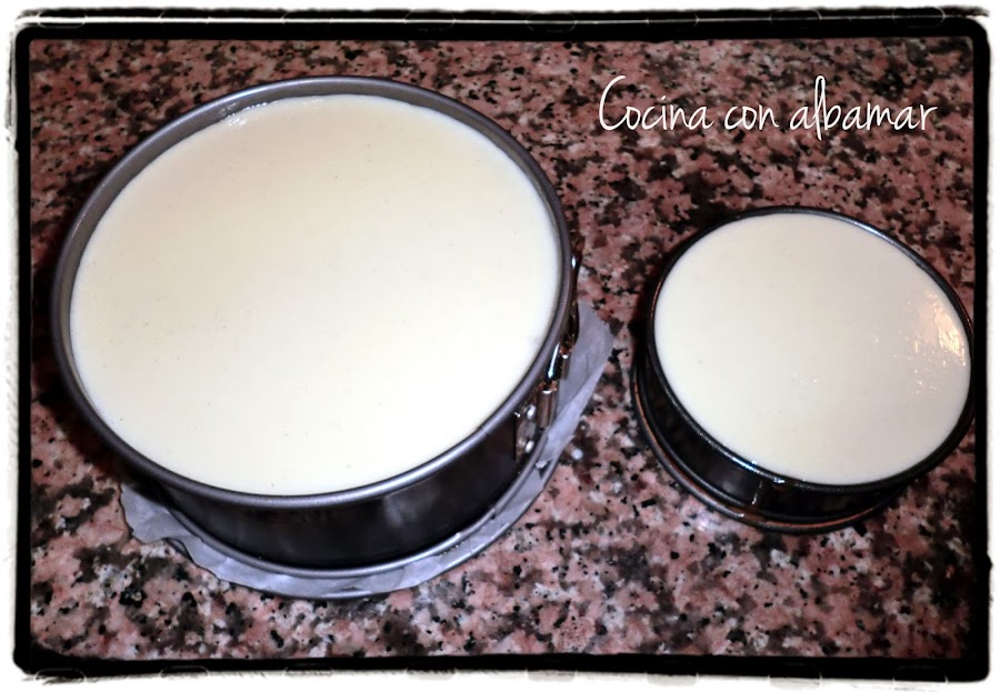 Echadlo en el molde rápidamente por encima de la galleta y dadle un par de golpecitos secos contra la mesa de trabajo para que suban las burbujas.