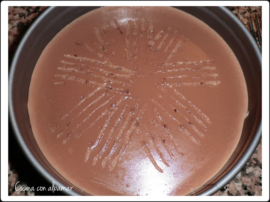 Al ser gelatinoso no debería pegarse en las paredes del molde pero como el mio es viejo y no me fiaba lo unté con un poco de desmoldante en spray, después de sacarlo de la nevera 24h lo desmoldé con cuidado quitando el lateral del molde.
