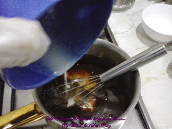 Cuando la mezcla hierva en el cazo, añadiremos el contenido del bol donde hemos puesto el sobre de cuajada, mezclando bien con las varillas manuales, hasta que vuelva a hervir. Cuando hierva retiramos el cazo del fuego, removemos de nuevo con las varillas durante un minuto, y volvemos a poner el cazo en el fuego otra vez. Cuando vuelva a hervir por segunda vez, retiramos el cazo porque ya esta lista la mezcla del primer piso de la tarta de tres chocolates.