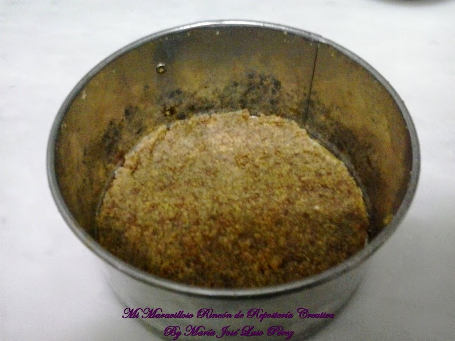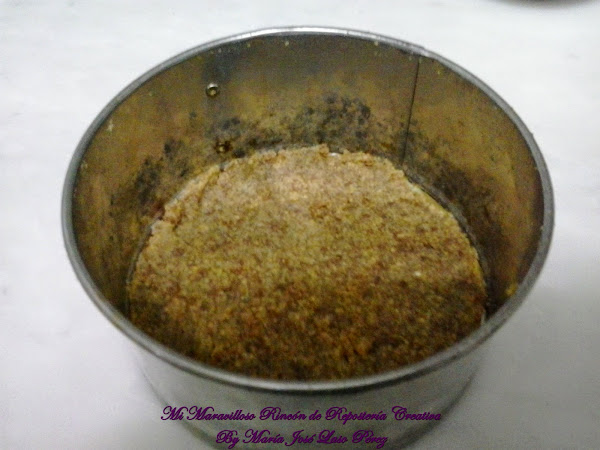 Trituramos con la picadora las galletas, las mezclamos con la mantequilla derretida y con los chips de chocolate para hacer la base de nuestra tarta. Ponemos la mezcla en el molde y con el dorso de una cuchara grande la aplastamos y repartimos por todo el fondo. Metemos en la nevera para que la base se compacte.