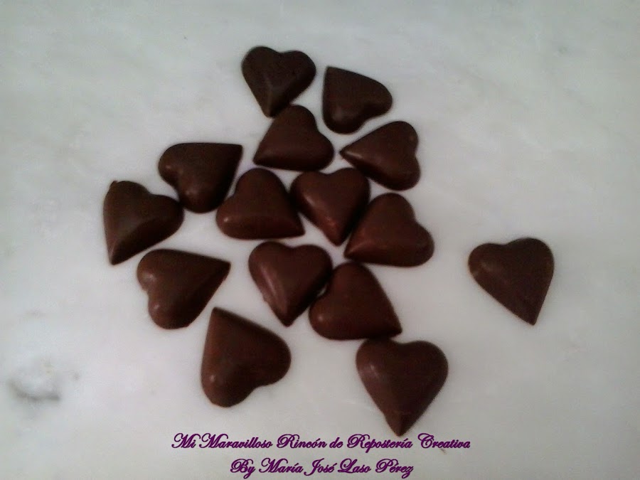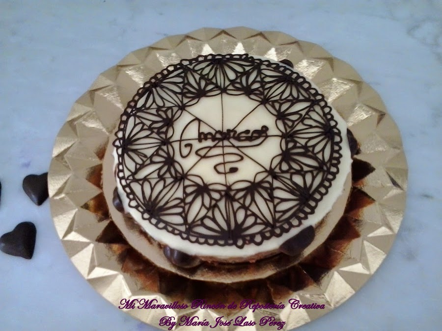Y para la decoración de la parte superior, fundí 50 gr de chocolate negro y lo puse en una manga desechable sin boquilla. Corté el pico de la manga muy pequeño, para que salieran hilos finos y así poder dibujar la filigrana. Con el chocolate que me sobró en la manga lo volví a fundir y lo eché en un molde de silicona para bombones con forma de corazones pequeños. Este fue el resultado. ¡Sorprendente! ¿Verdad?