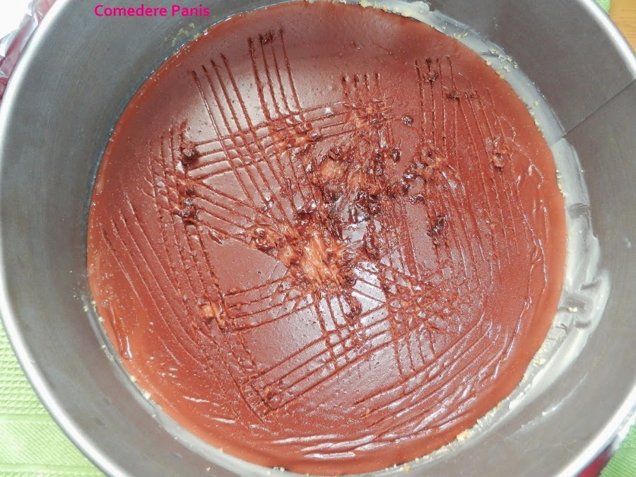 Cuando el chocolate y la nata (crema de leche) comience a hervir retiramos del fuego y añadimos los 250 m. de leche junto a la cuajada, removemos muy bien y llevamos otra vez al fuego hasta que vuelva a hervir, luego retiramos y vertemos sobre la base de galletas. Guardamos en la nevera durante un mínimo de una hora.