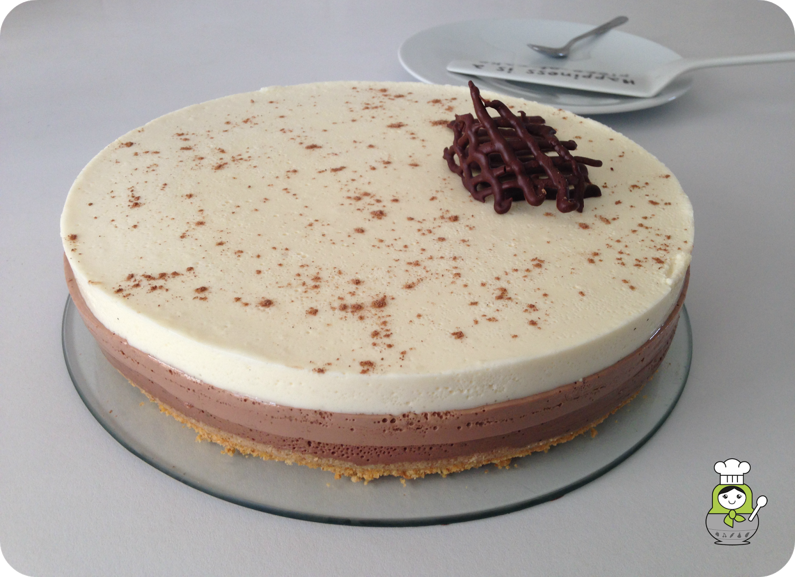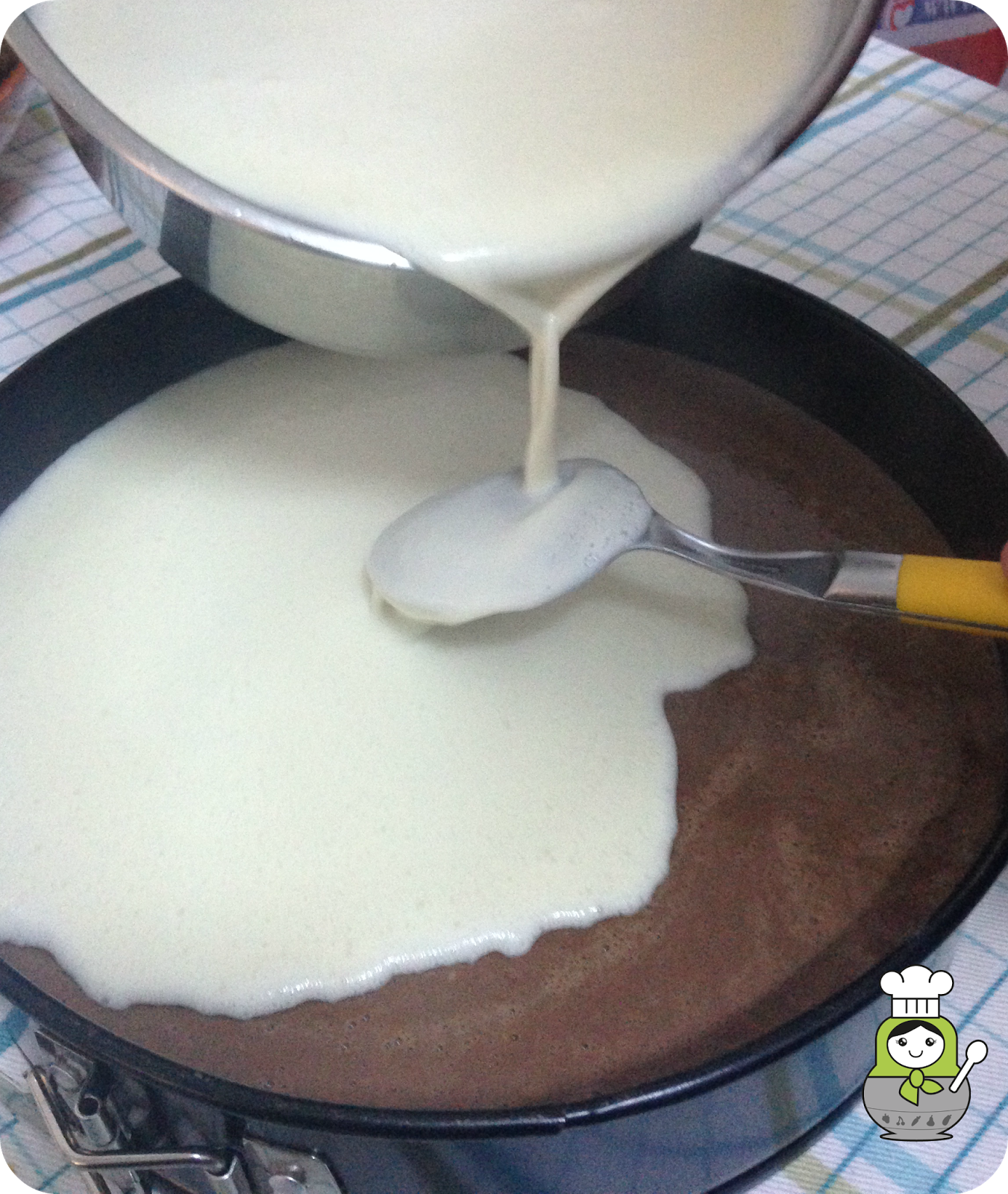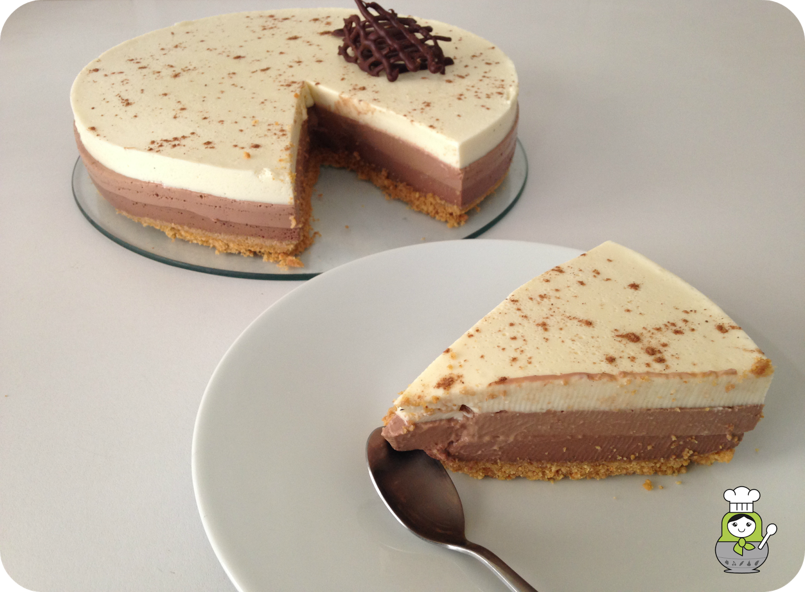 Vertemos la capa de chocolate con leche sobre la capa de chocolate negro, que recordad debe estar rayada previamente. Para evitar destrozar la capa inferior con el chorro de líquido, basta con verter el chorro sobre una cuchara y que así el líquido caiga indirectamente y con menos fuerza sobre la tarta. una vez más, reservamos en el frigorífico hasta que cuaje.