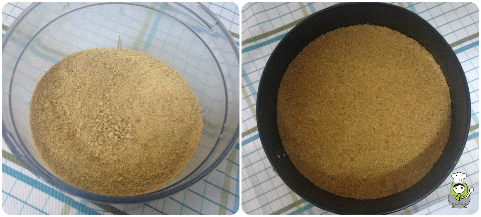 Para preparar la base de la tarta, trituramos el paquete de galletas y le añadimos la mantequilla derretida. Mezclamos bien ambos ingredientes y vertemos la mezcla en el molde desmontable. En mi caso, suelo colocar papel de horno en la base del horno para que sea más fácil el desmoldado, pero no es imprescindible. Presionamos bien con ayuda de una cuchara para que resulte una base firme y lisa. Reservamos en el frigorífico.