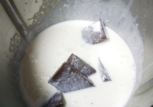 4- Repetir el proceso con el chocolate negro, añadiendo 50 gramos de azúcar el cual ya habrá cuajado lo suficiente (verter con un cucharón debajo del chorro, para suavizar la caída). Dejar cuajar una media hora.