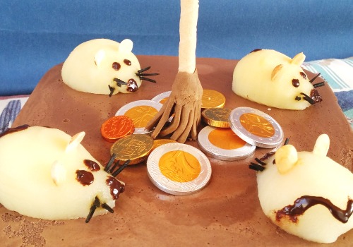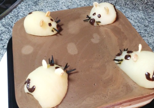 Las peras hacen del cuerpo de los ratones. Gotitas de chocolate hacen las veces de ojos y boca