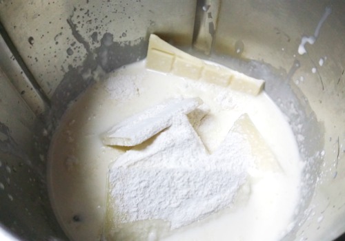 Pues eso: Poner el chocolate blanco, 250 ml de leche, 250 ml de nata (crema de leche) y un sobre de cuajada. 7 minutos 90ºC velocidad 5. Volcar sobre la base de galleta.Dejar cuajar una media hora.