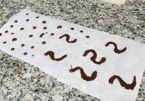 6- Para los adornos: Hacer los rabitos de los ratones colocando el chocolate fundido sobre papel de horno.