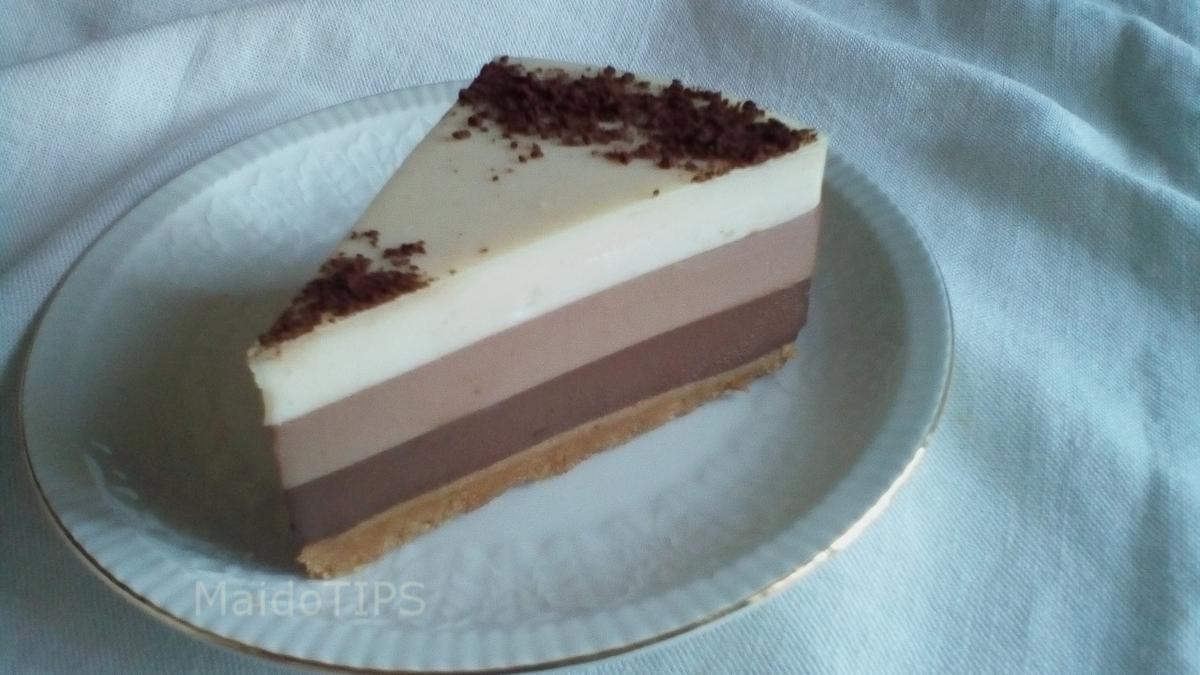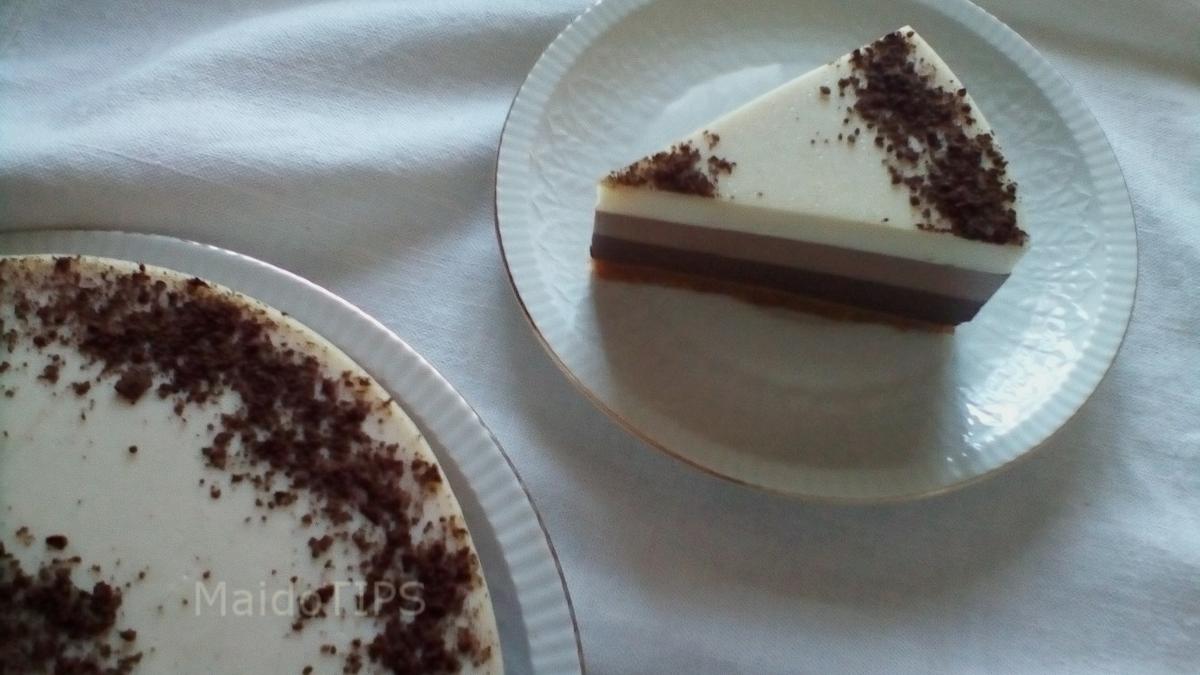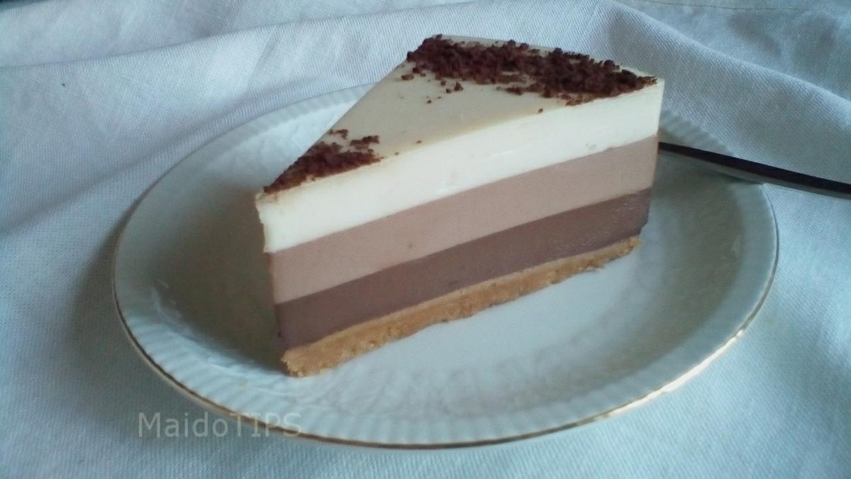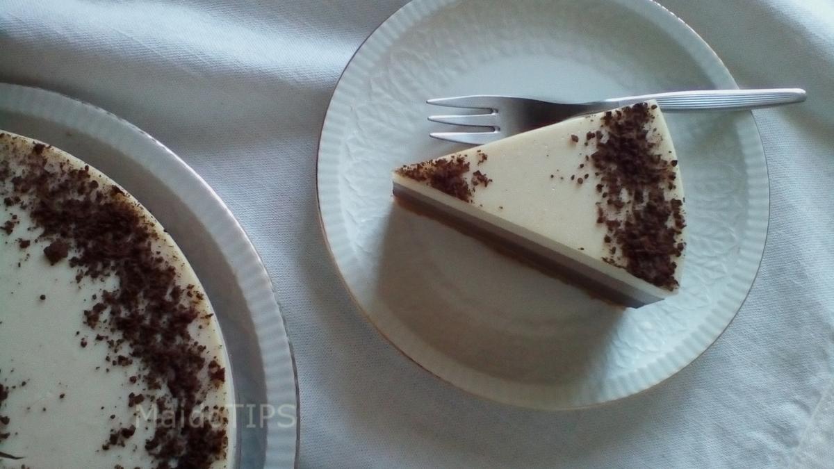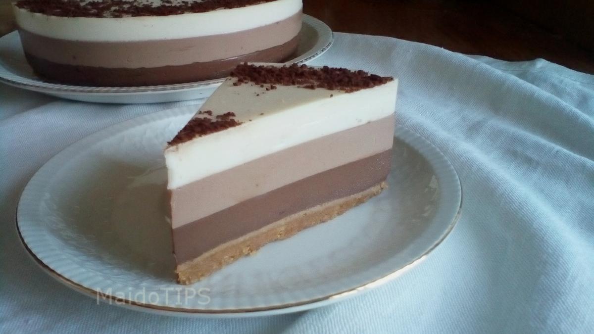 Una vez hervida la mezcla 2 o 3 minutos, la vertemos sobre una espatula repartiendo suavemente sobre la mezcla anterior de chocolate con leche, dejar cuajar y enfriar totalmente ( 1 hora aprox.) sin mover de sitio, solo nos quedará meter el molde dentro del frigorífico de un dia para otro, ojo! no antes para un cuajado y reposo ideal. Ya justo antes de servirla, espolvorear con cacao puro el lateral de la tarta y formar un círculo en el centro. Y a disfrutar de ese triple de chocolate!
